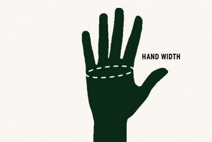 BREITE: Messen Sie bei geöffneter Hand den Umfang Ihrer dominanten Hand direkt unter den Fingern.