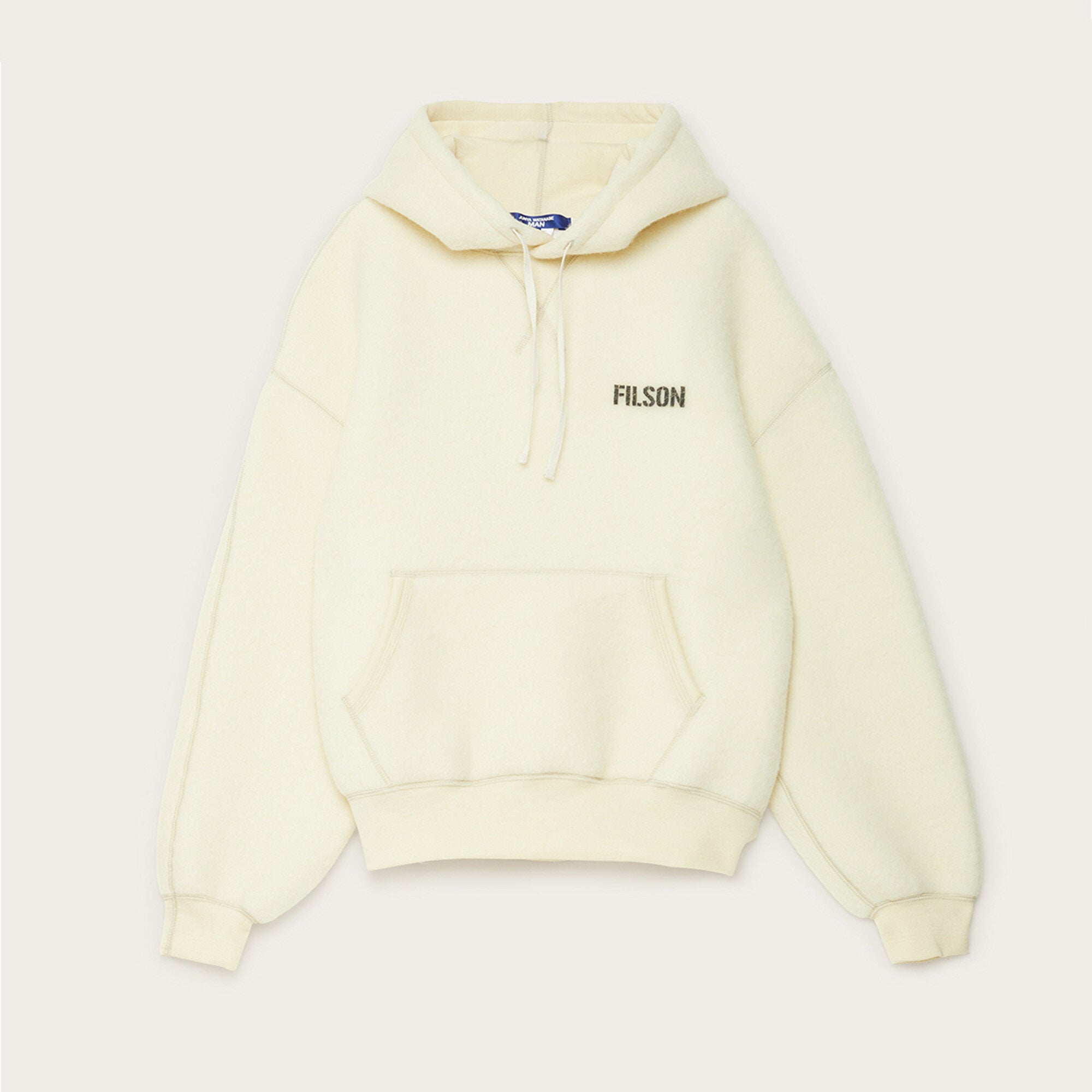 Hergestellt aus Woll-Nylon-Rippjersey bietet dieser Hoodie Wärme und Struktur in einer raffinierten Silhouette. Zum Design gehören eine mit Kordelzug verstellbare Kapuze, Raglanärmel am Rücken und eine Kängurutasche vorne für praktische Funktionalität. Ein auffälliger Grafikdruck auf dem Rücken hebt die exklusive Zusammenarbeit hervor. Rippbündchen an Ärmeln und Saum sorgen für Komfort und Formstabilität.