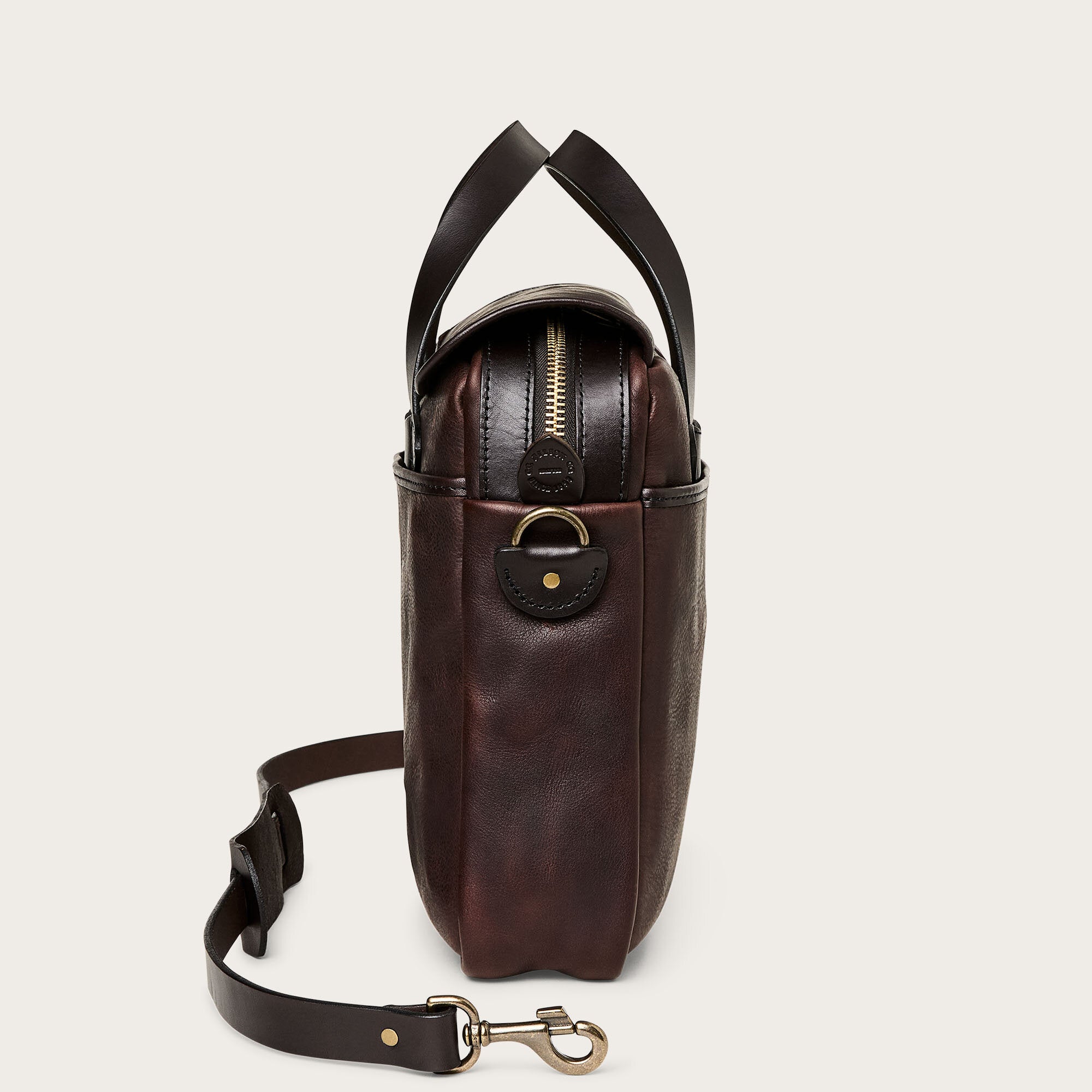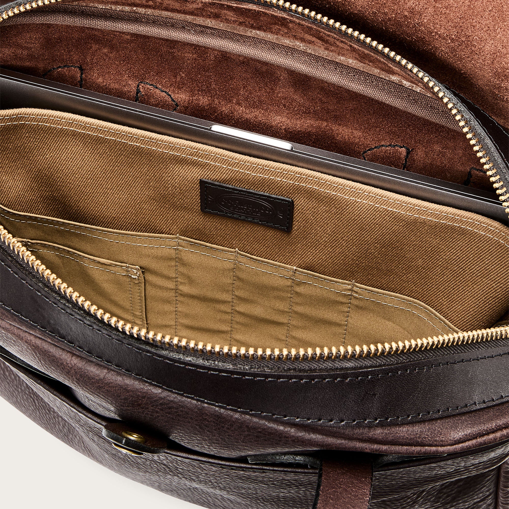 Unsere Original Briefcase ist eine zeitlos schlichte Aktentasche, die sich seit über drei Jahrzehnten im täglichen Einsatz bewährt. Millionen von Reisemeilen – in der Luft und am Boden – haben ihren Ruf für unübertroffene Haltbarkeit geprägt. Diese Version aus Leder in Erbstückqualität des ikonischen Modells ist dafür gemacht, über Generationen weitergegeben zu werden. Das Adirondack Leather stammt von der Seidel Leather Corp. in Milwaukee, Wisconsin. Hochwertige, in den USA bezogene Rinderhäute werden mit großzügigen Mengen an Ölen und Wachsen gegerbt – für einen tiefen Glanz und die charakteristische Pull-up-Optik Nach dem Gerben werden die kräftigen Häute trommelgegerbt, um eine natürliche, leicht genarbte Textur zu erzeugen. Anders als bei geprägten oder tiefgepressten Mustern variiert diese natürliche Narbung über die gesamte Haut und macht jedes Lederstück zum Unikat. Die Griffe, der Gurt und die Verstärkungen des Reißverschlusses sind aus pflanzlich gegerbtem Bridle Leather gefertigt, das stark genug für Pferdezubehör ist. Innere Fächern für Akten oder einen Laptop sorgen für eine organisierte Aufbewahrung. Stautaschen über die gesamte Breite außen bieten schnellen Zugriff auf die wichtigsten Dinge. Schwerer YKK®-Metallreißverschluss mit Regenklappe. Gefüttert mit Baumwollcanvas (170 g).