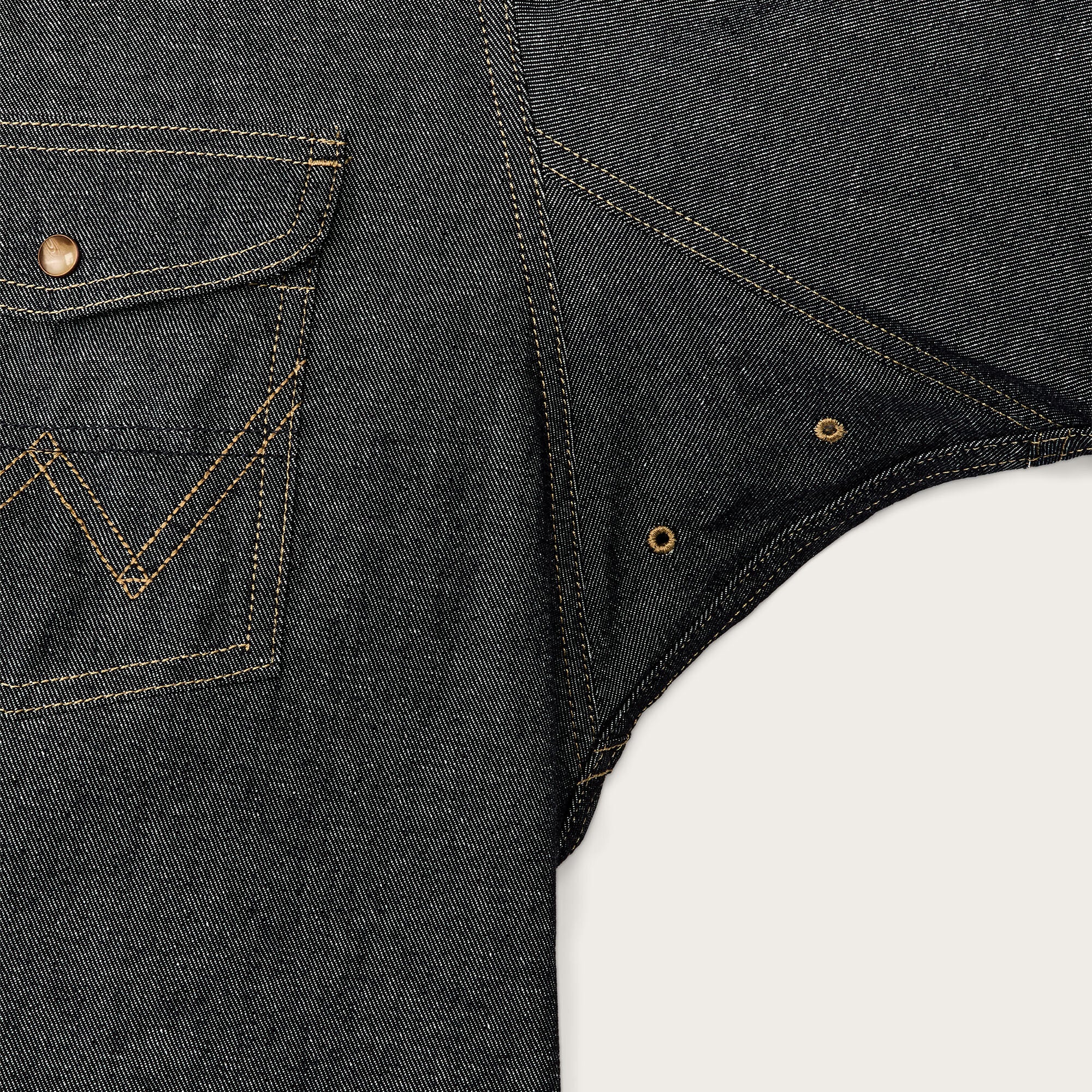 Ein strapazierfähiges Hemd in Sonderedition aus Denim (207 g) mit Rechtsköperbindung. Die legendäre Robustheit und der Komfort von Denim – bewährt auf Ranches, Baustellen und Marineschiffen – haben ihn zu einem der beliebtesten Stoffe für Arbeit und Alltag gemacht. Die Schultern bestehen aus waschbarem, gewachstem Canvas, das zusätzliche Strapazierfähigkeit und leichten Nässeschutz bietet, falls man ohne Jacke in einen Regenschauer gerät. Die Rückenpasse ist für bessere Atmungsaktivität belüftet, und die spitz zulaufende Vorderpasse sorgt für authentisches Western-Flair. Antik-bronzefarbene Druckknöpfe schließen Vorderseite, Taschenklappen und Ärmelbündchen. Die Unterarme sind mit dem gleichen waschbaren, gewachsten Canvas verstärkt wie die Schulterpasse. Das charakteristische „W“ von Wrangler ist auf die Vordertaschen gestickt.