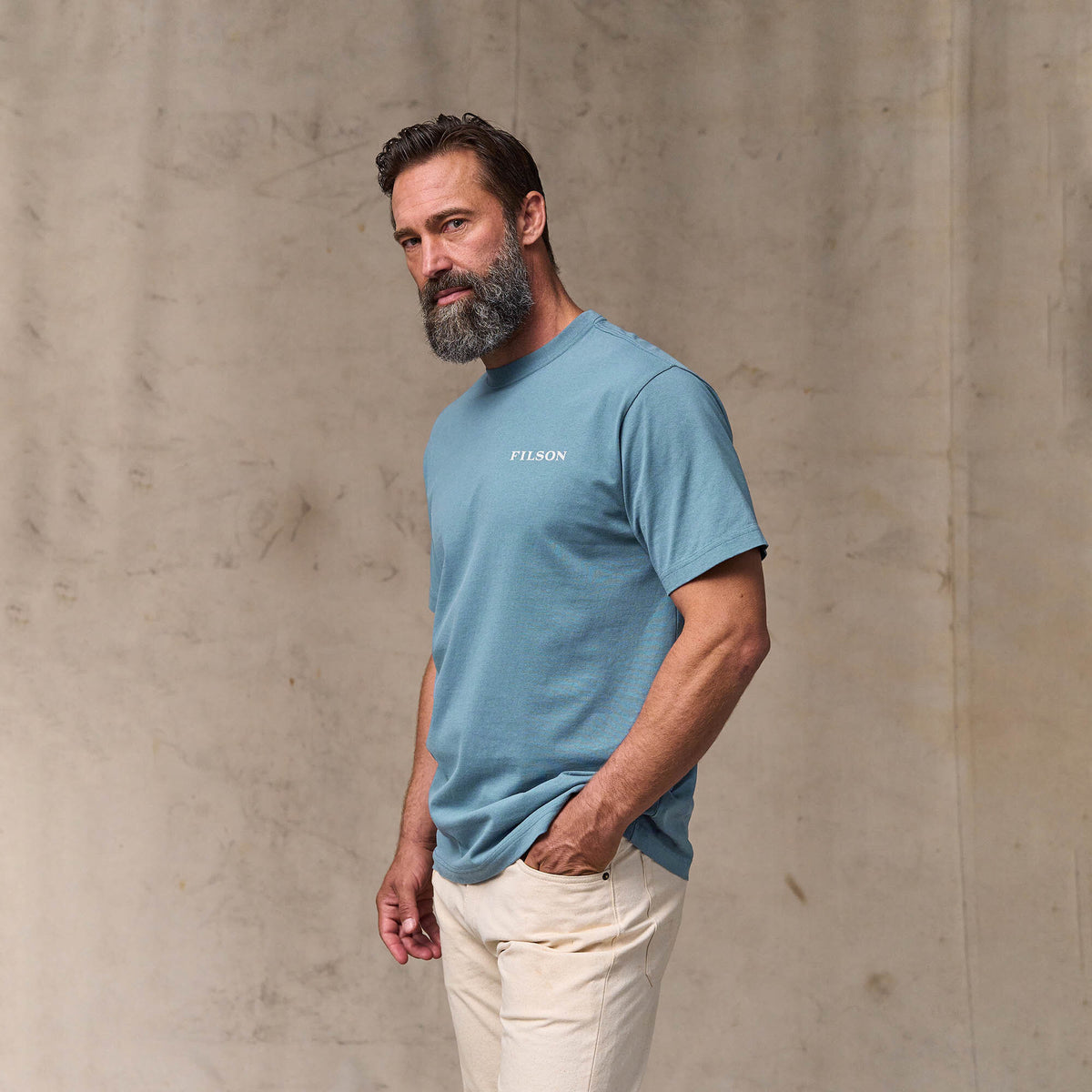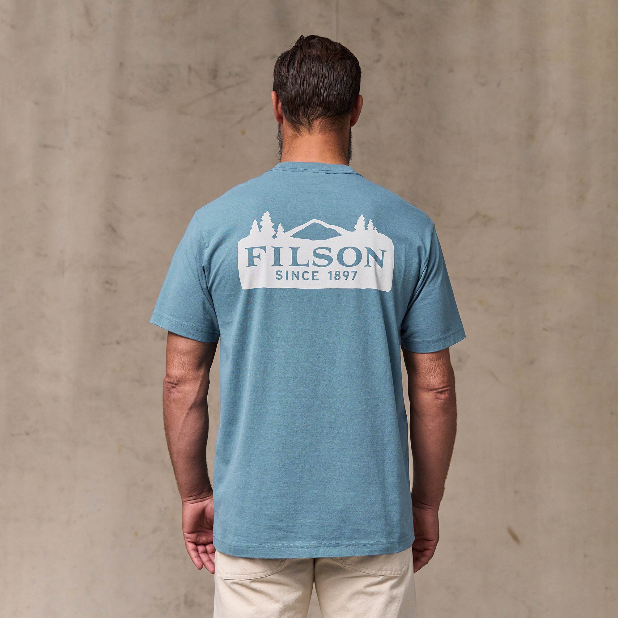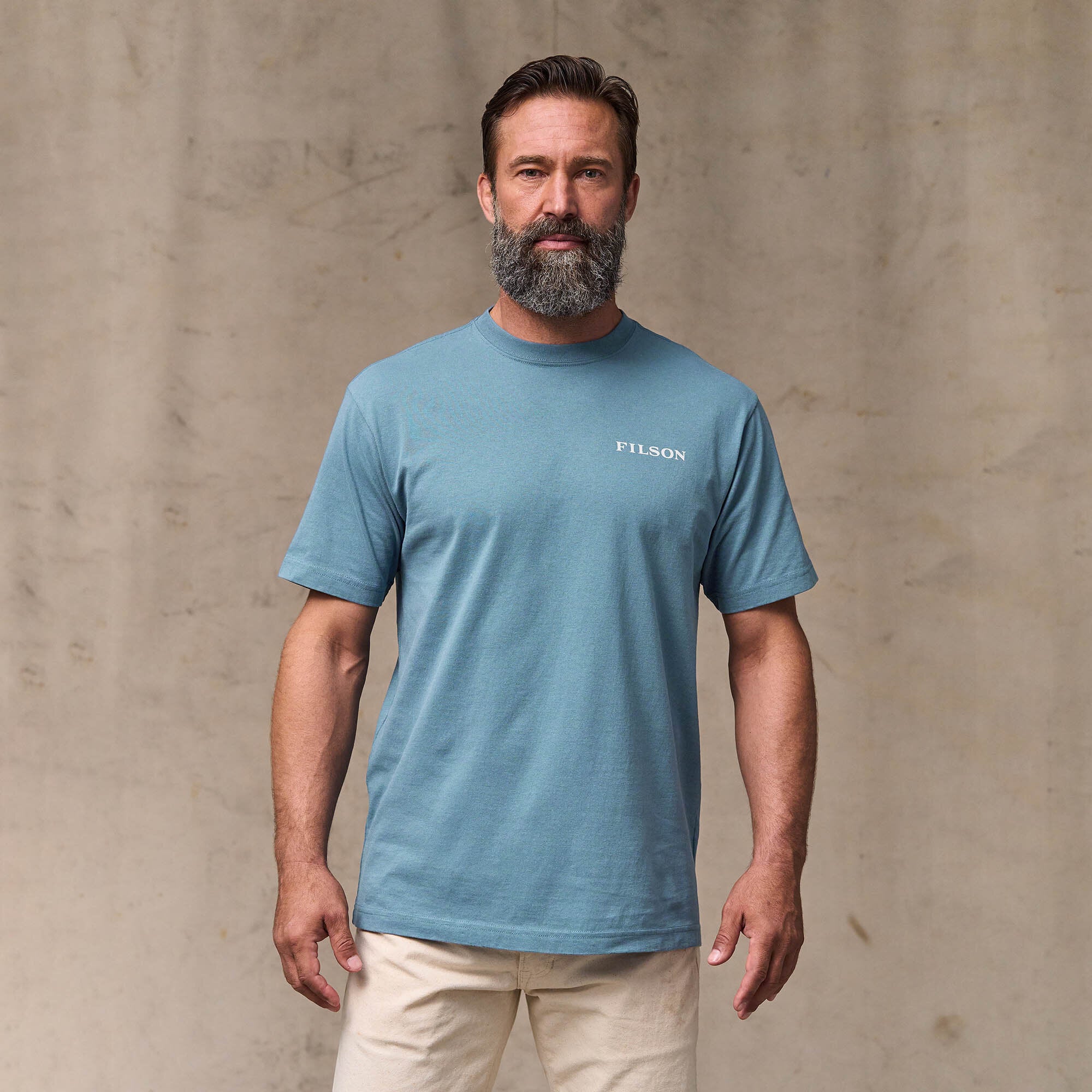 Our Scenic Graphic T-Shirt is made from premium Peruvian cotton for outstanding next-to skin comfort. The 5.2-oz. fabric is comfortable in the summer heat or as a first layer when the temperature drops. The 1x1 rib-knit collar retains its shape. Custom Filson logo graphic.