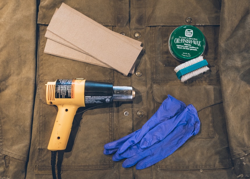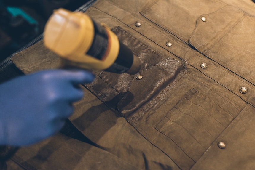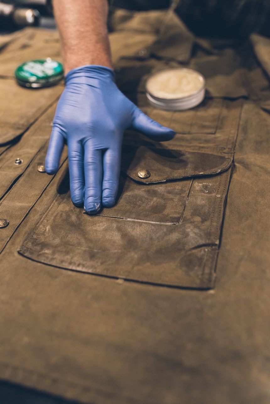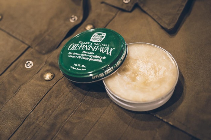 Nos vêtements en coton ciré sont conçus pour des années d'utilisation intensive en plein air. Si une nouvelle application de cire est nécessaire, utilisez uniquement la Cire de finition originale à l'huile de Filson. Il contient un mélange exclusif de cire de paraffine et d'huiles adoucissantes qui correspond exactement à la finition cirée d'origine appliquée en usine. Ne soyez pas tenté(e) d'utiliser de la cire d'abeille ou d'autres cires, car elles ne se mélangeront pas à la cire existante dans le tissu et ne créeront pas la tension superficielle nécessaire pour maximiser la résistance à l'eau.