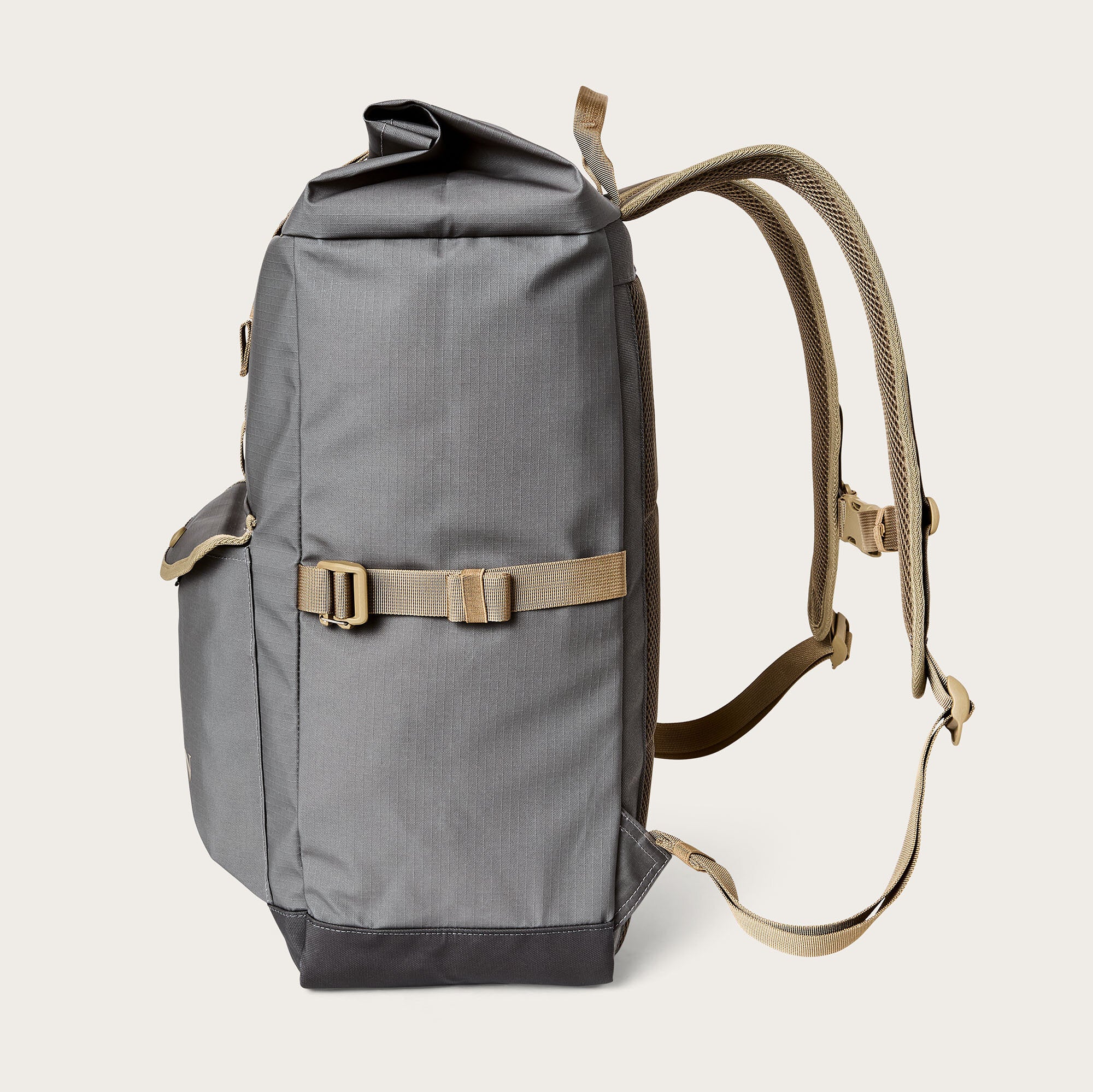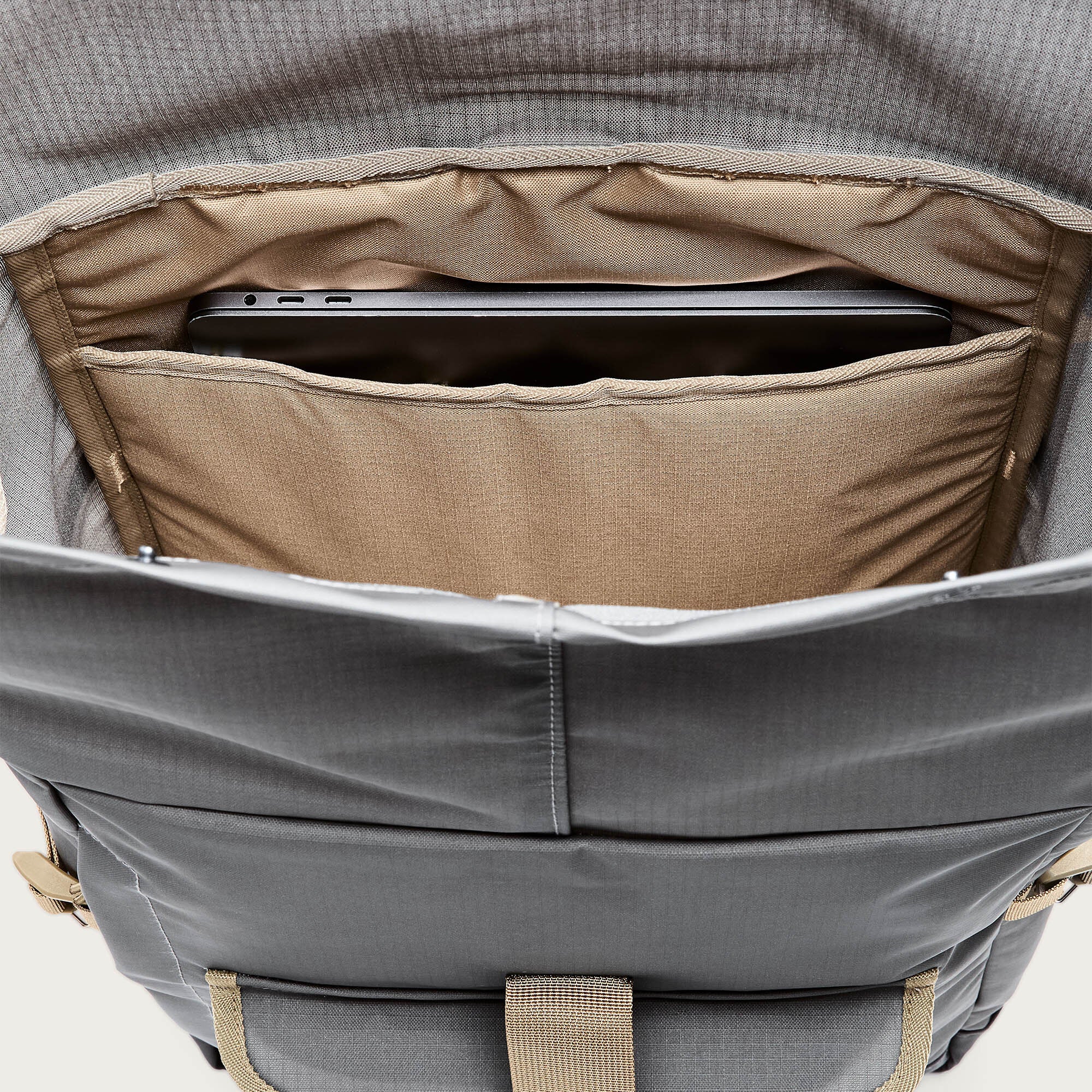 Le sac principal est fabriqué en tissu ripstop 300 D de poids moyen tandis que le fond est en Oxford mat 600 D. Le panneau dorsal et les bretelles profilées sont rembourrés en tissu résille 3D pour plus de confort et de respirabilité. Une sangle sternale réglable permet de maintenir les bretelles en place. Une poche à rabat est superposée à une poche latérale zippée afin de vous garantir une accessibilité rapide à vos petits objets essentiels. La fermeture roll-top à boucle - une fermeture dont l’efficacité n’est plus à prouver - empêche la pénétration d’eau tout en garantissant un accès facile au compartiment principal. Ce sac à dos résistant à l’eau est doté d’une poche intérieure pour ordinateur portable ainsi que de sangles de compression sur chaque côté permettant de stabiliser le sac en fonction de la taille des charges.