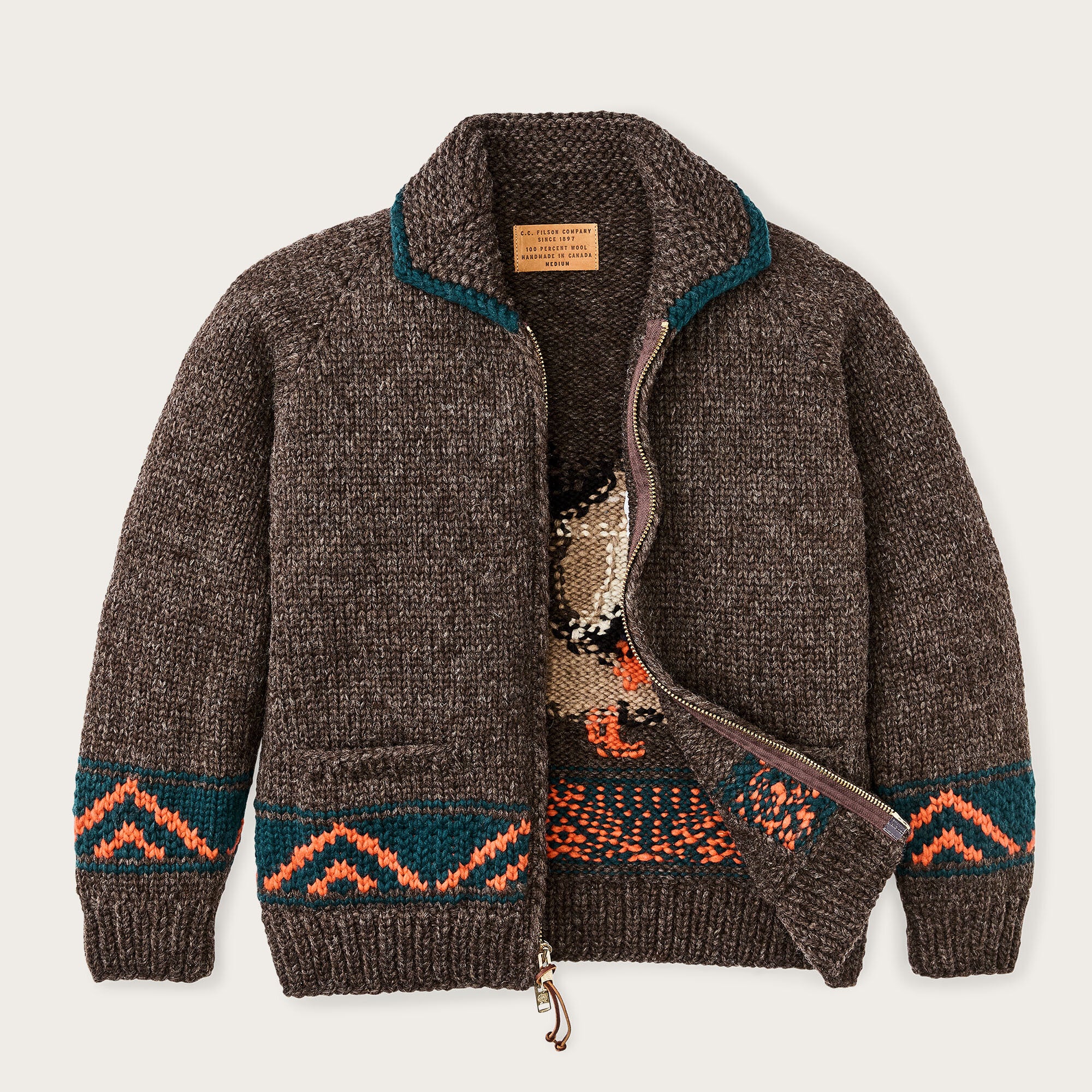 Ce pull fait main en édition limitée est fabriqué en Colombie-Britannique avec les mêmes techniques ancestrales utilisées depuis les années 1800. Les fils épais 100 % laine sont tricotés par des mains expertes pour former un généreux pull-over à glissière intégrale qui est très respirant et aussi chaud qu’un manteau. La fermeture à glissière frontale de gros calibre s’ouvre en haut et en bas pour une régulation adaptative de la chaleur. Poches à entrée verticale sur le devant. Col rabattu. Avec un graphisme unique pour 2025, ce pull de qualité artisanale est disponible en quantités limitées.