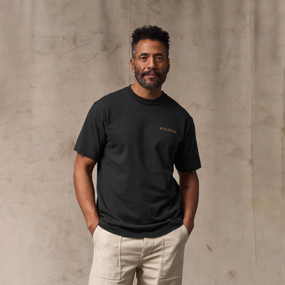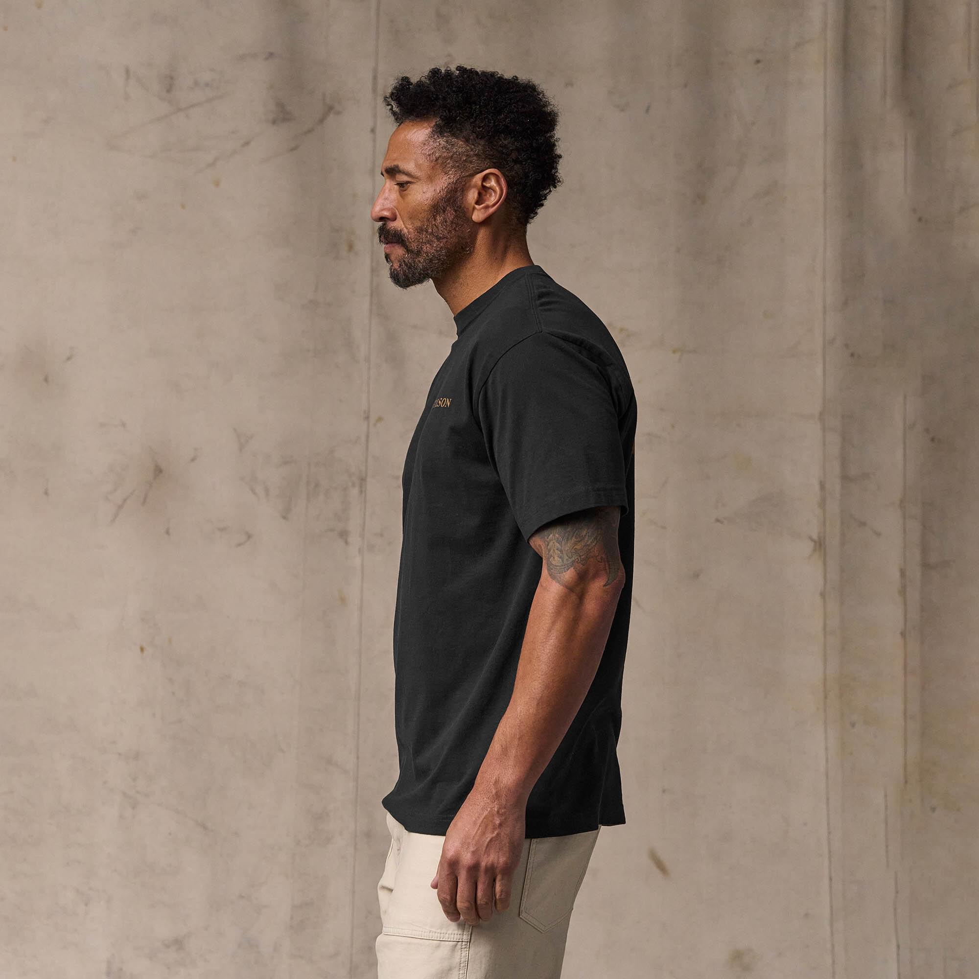 Notre t-shirt Scenic Graphic est fabriqué en coton péruvien de première qualité pour un confort exceptionnel au contact de la peau. Le tissu de 147,4 g est confortable dans la chaleur de l'été ou comme première couche lorsque la température baisse. Le col avec côte 1 x 1 conserve sa forme. Graphisme logo Filson personnalisé.