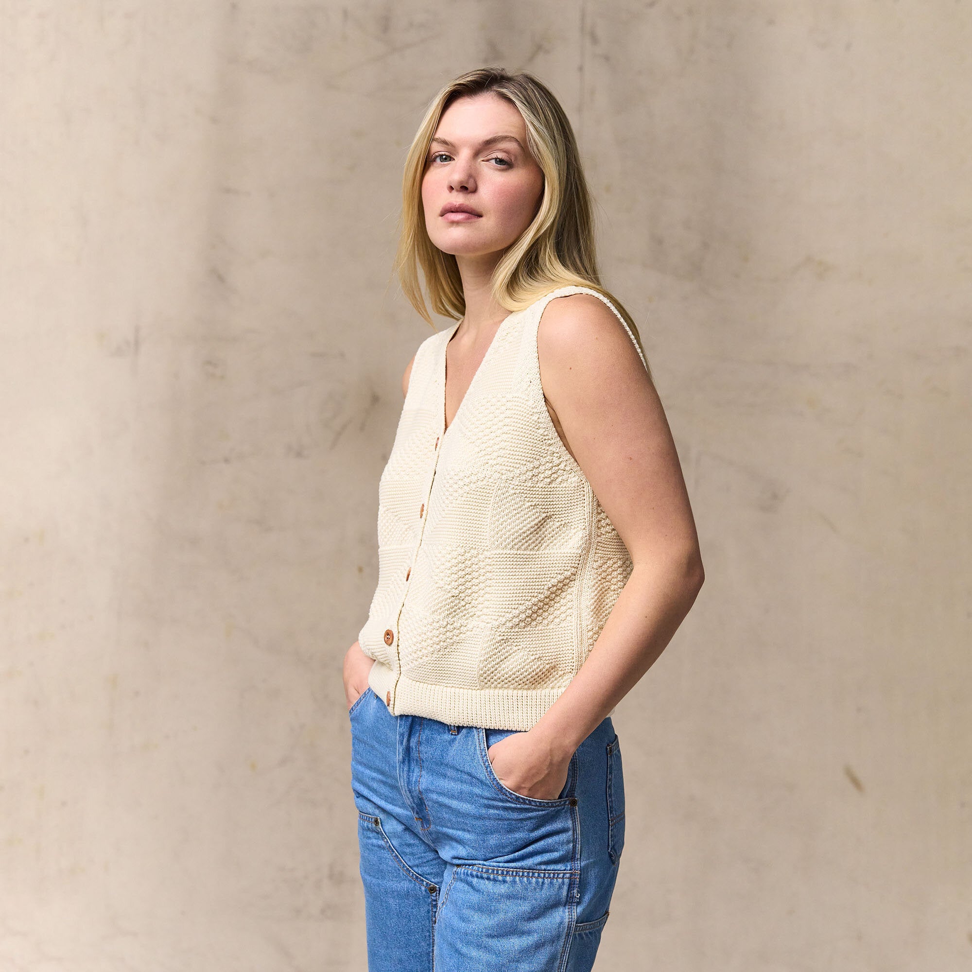 L'encolure en V se superpose parfaitement aux chemises ou se glisse sous les vêtements d'extérieur, tandis que la fermeture frontale par boutons permet d'ajuster facilement la température. Le coton doux et respirant en fait un choix idéal lorsque le temps change ou que la journée de travail s'étire de la fraîcheur du matin au soleil de l'après-midi.