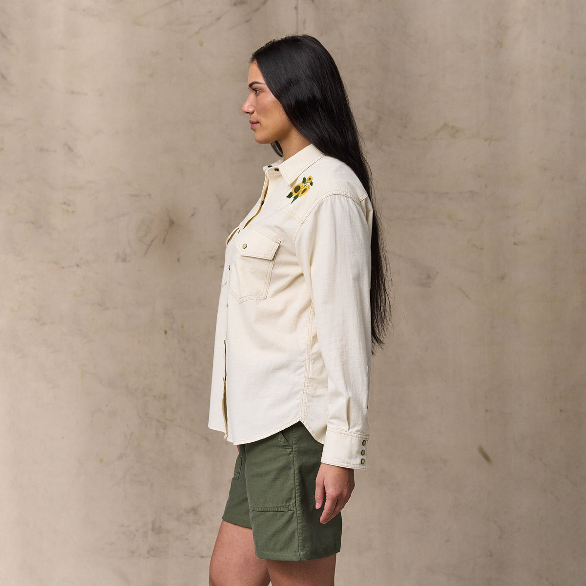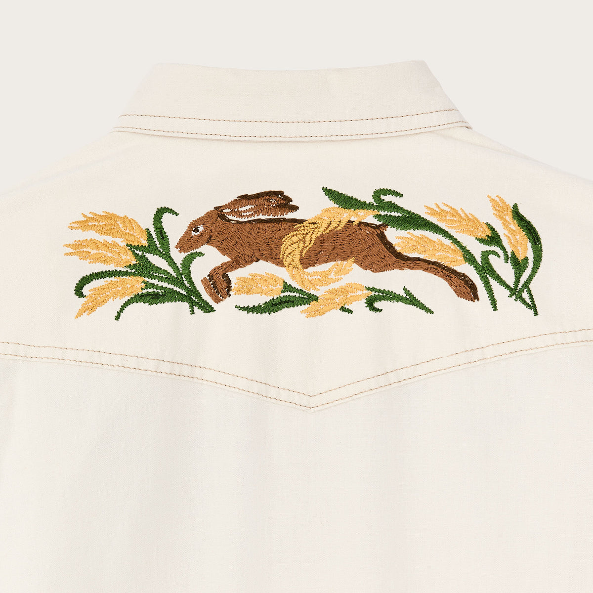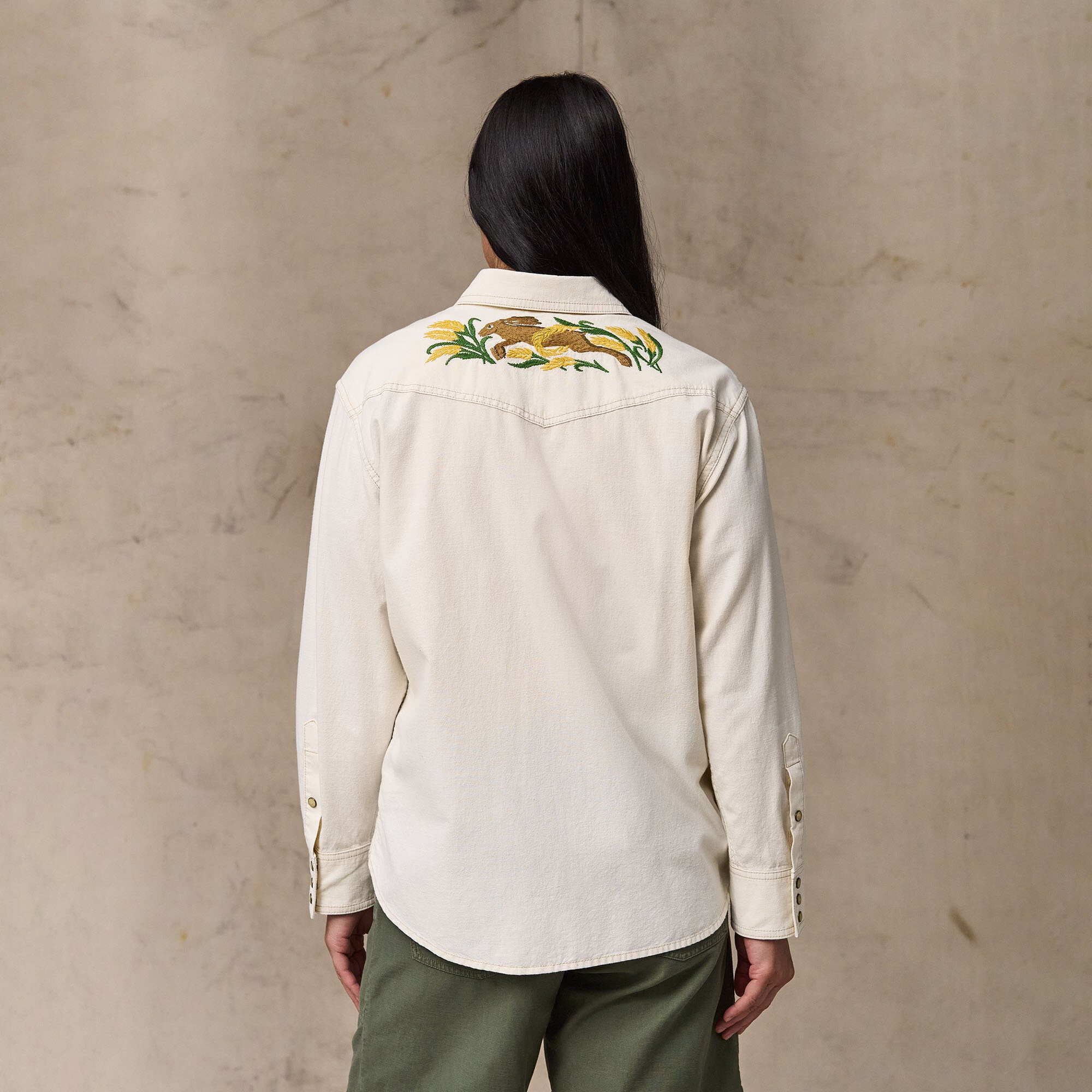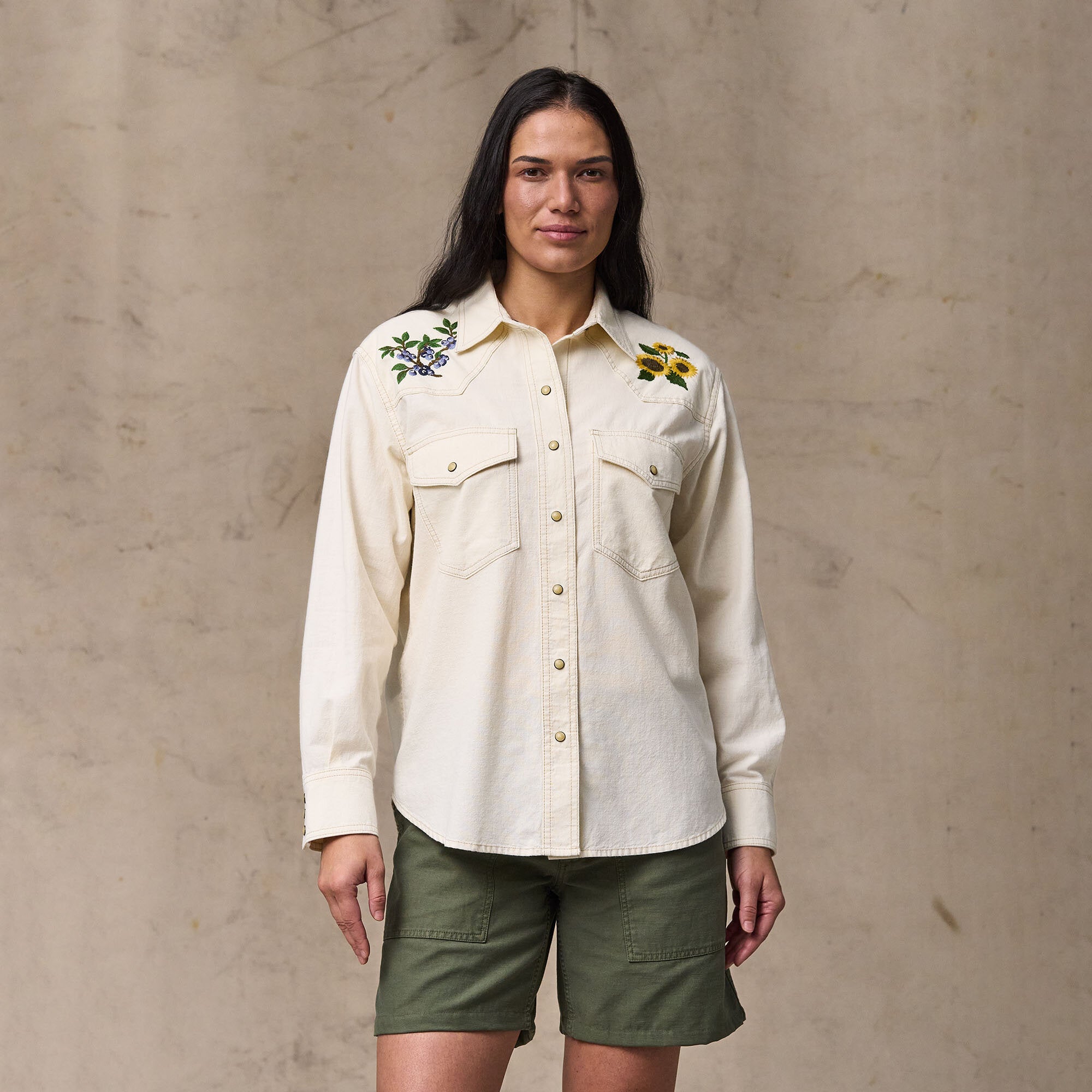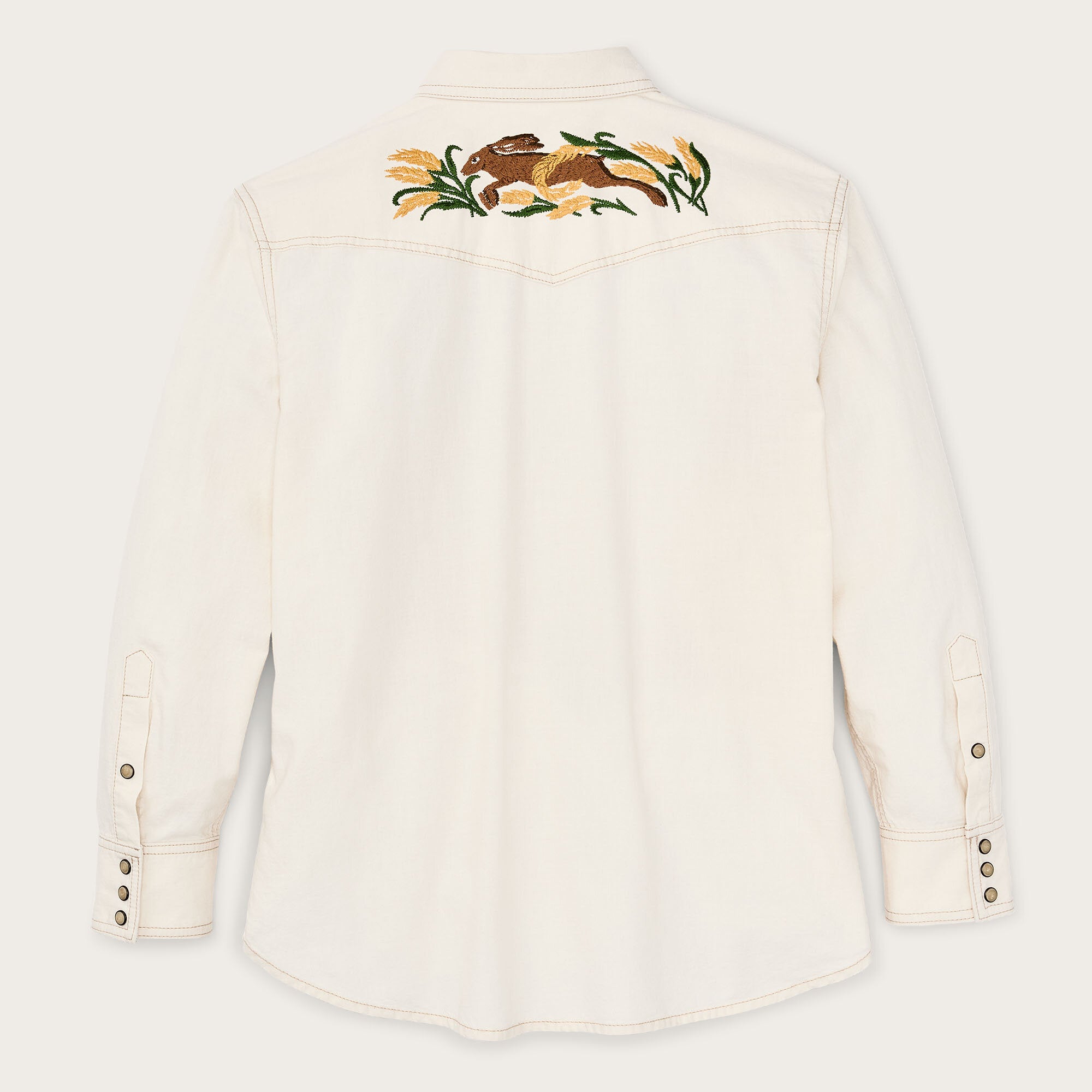 Une chemise de style western en chambray de coton, un tissu léger et durable qui puise ses origines dans les vêtements de travail classiques. Fidèles à la tradition, les poches et l’empiècement sont à pointe, tandis que le devant et les poignets se ferment par des boutons-pression. Les broderies de la faune et de la flore sur l’empiècement avant et dans le dos ajoutent une touche de style. Col italien et ourlet arrondi.