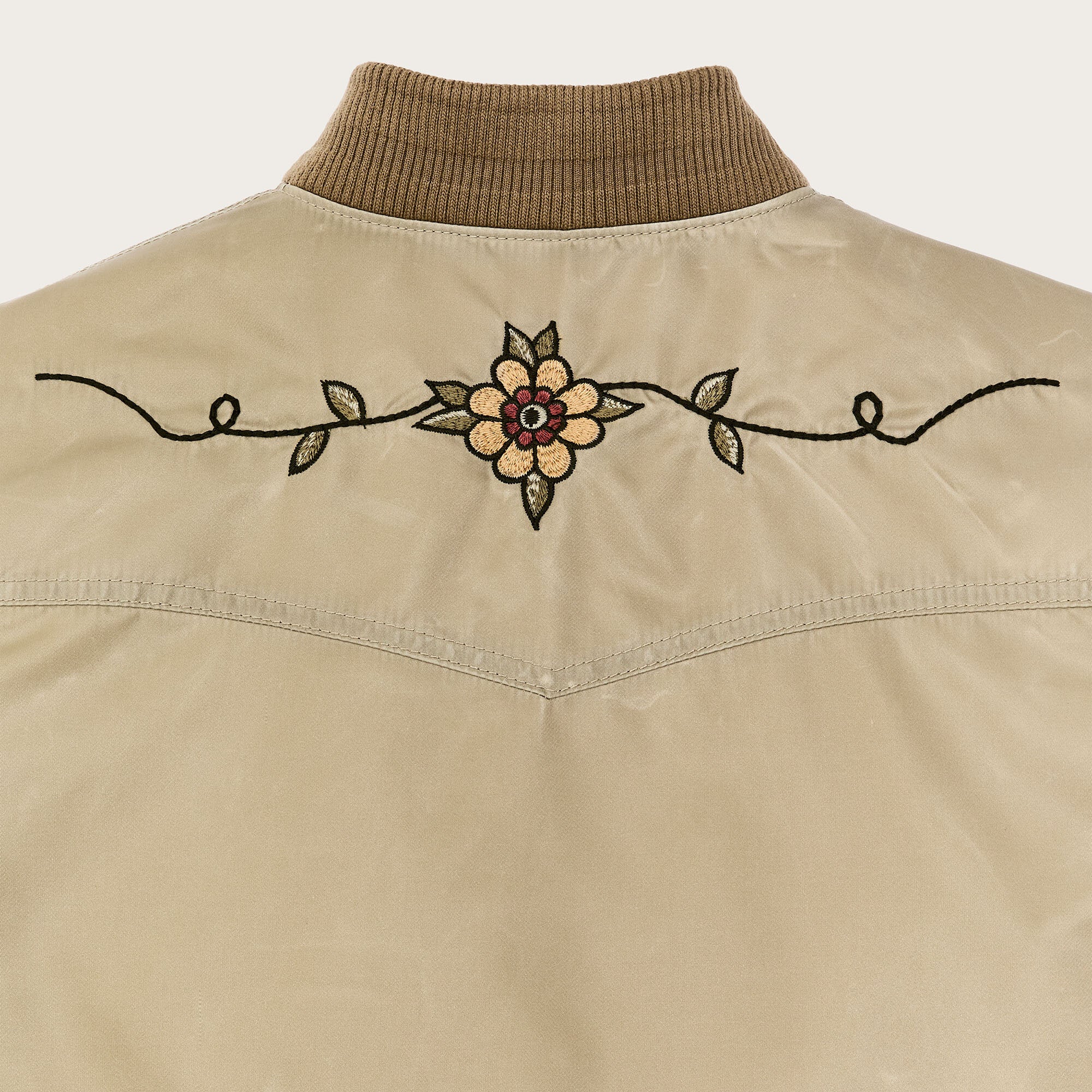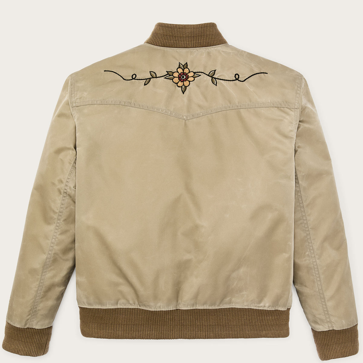 La fermeture par boutons-pression sur le devant et les poignets, l'ourlet et le col en maille côtelée garantissent un ajustement confortable qui suit chacun de vos mouvements. Des graphismes brodés soulignent les empiècements incurvés à l'avant et à l'arrière, apportant une touche western distinctive. Coupe avec longueur à la taille pour des lignes épurées et une superposition facile.